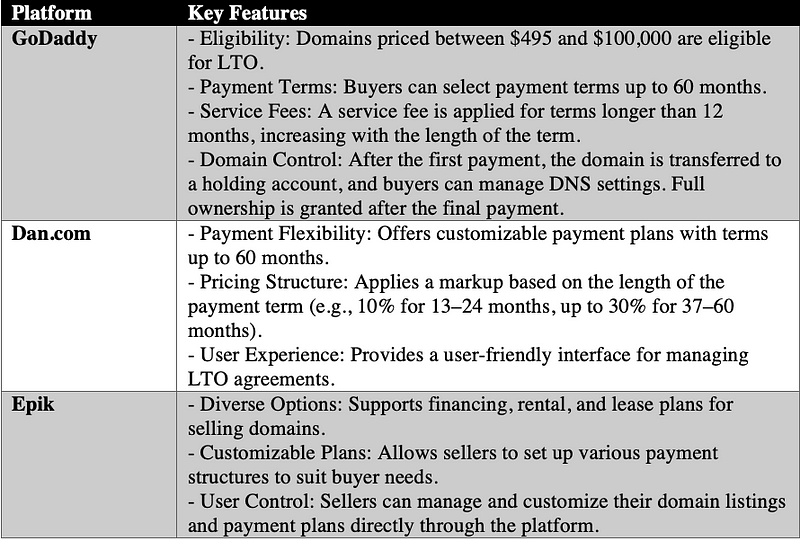 Several platforms facilitate lease-to-own arrangements for domain names. Below is a comparative overview of some prominent providers: